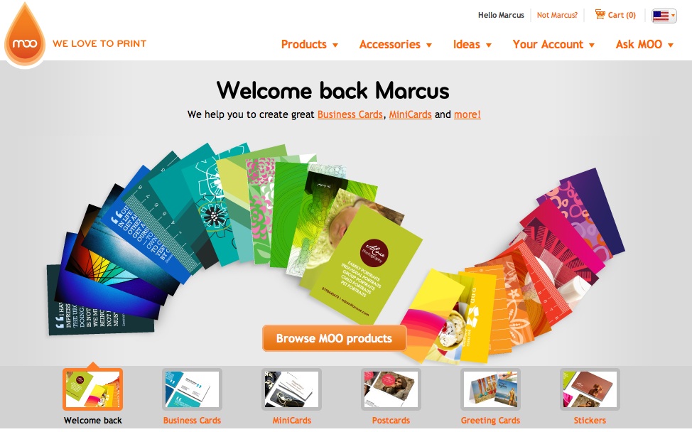 Moo.com has figured out a way to take a normally boring product (business cards) in an otherwise dull industry (printing) and carve out a unique, specific and endearing niche for themselves. That engaging approach is brilliantly demonstrated on their website.