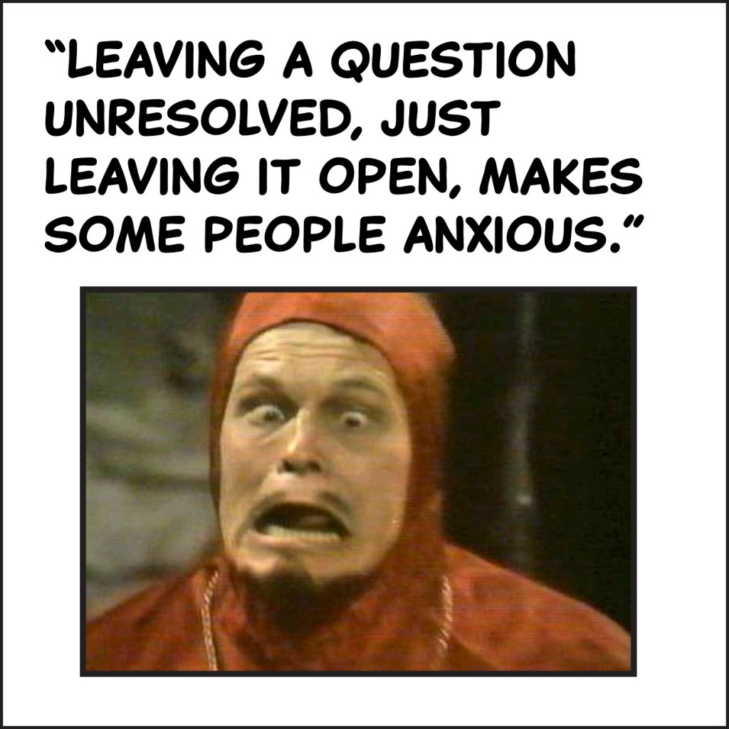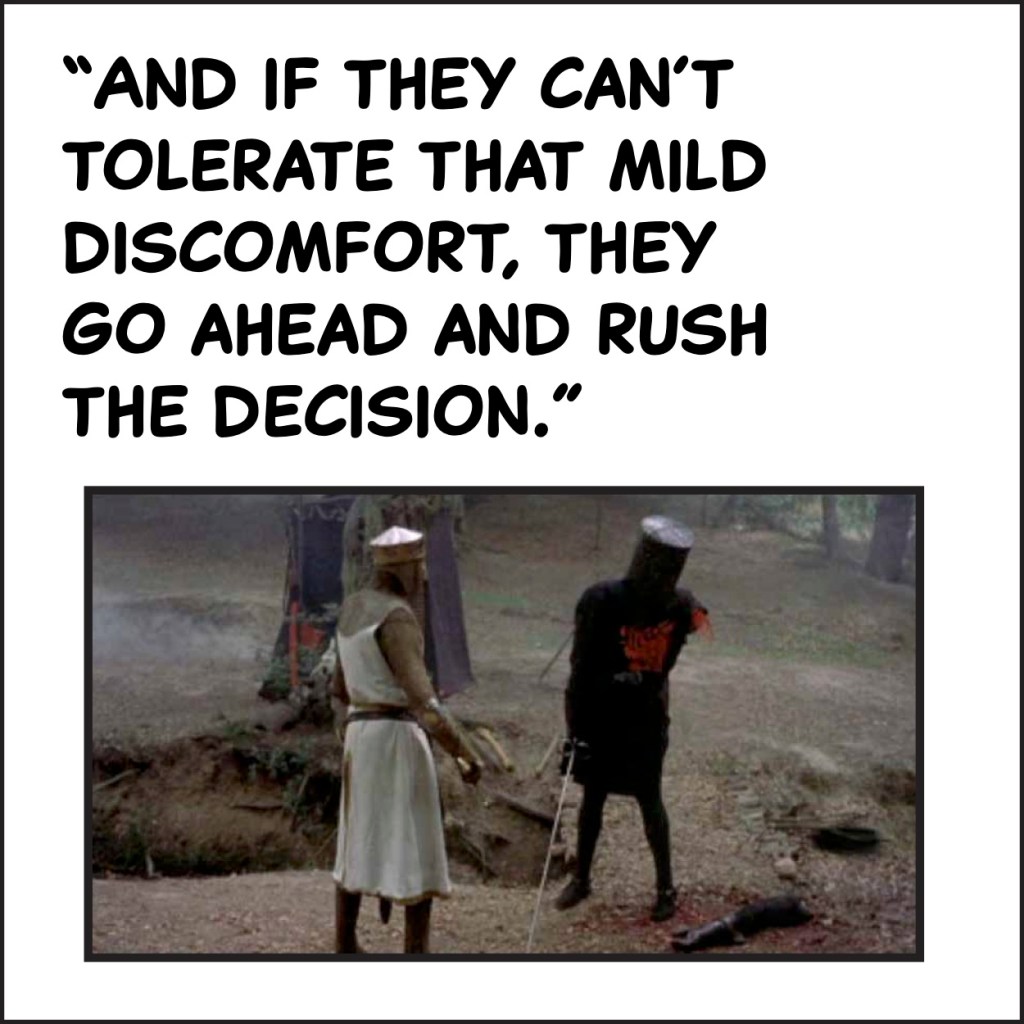 “Leaving a question unresolved, just leaving it open, makes some people anxious. And if they can’t tolerate that mild discomfort, they go ahead and rush the decision.” John Cleese