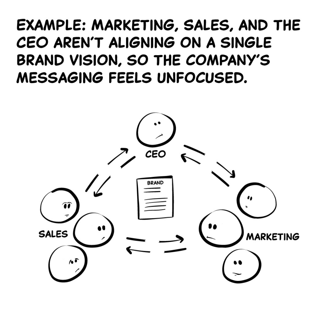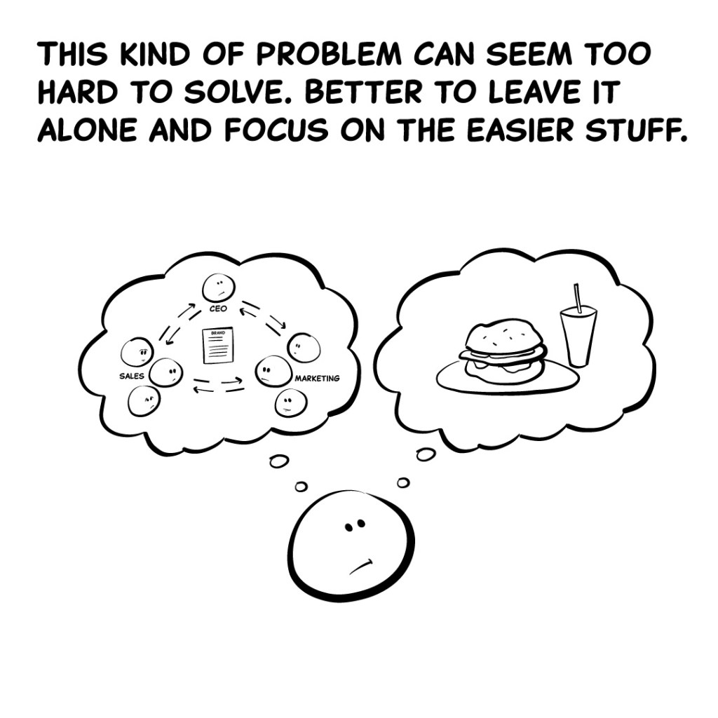 Example: Marketing, Sales, and the CEO aren’t aligning on a single brand vision, so the company’s messaging feels unfocused. This kind of problem can seem too hard to solve. Better to leave it alone and focus on the easier stuff.